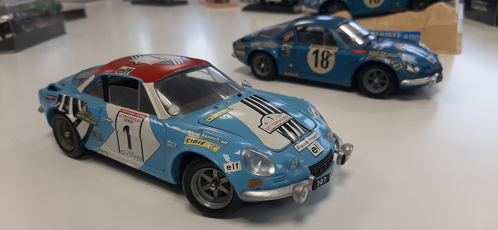 Pierre est venu avec Trois Alpine A110 1600S N°18 MONTE CARLO 1973 au 1/24e, dont une avec son socle d'exposition.