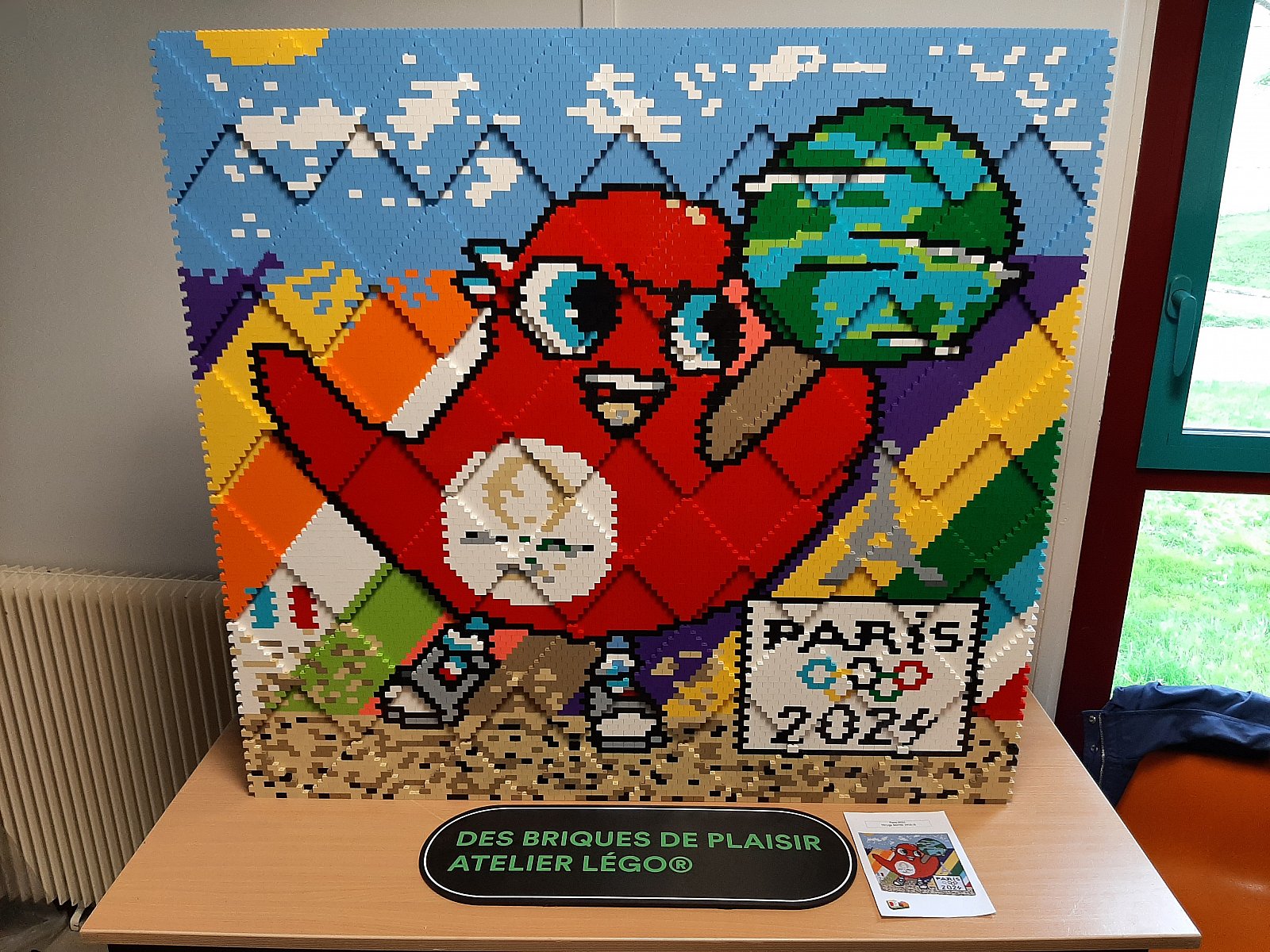 Au choix, participation à une fresque collaborative (ou mosaïque) composée de losanges à construire suivant une notice. Puis on les assemble pour donner le résultat final. Il fallait reconstituer ici la mascotte des Jeux Olympiques, le phryge ! Ce choix est purement personnel et la mascotte plait aux enfants comme à nous ;-)